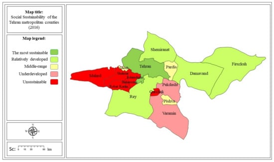 In the following stage, the ANP model was shaped with the help of these factors, and the super matrix of social dimension was also shaped. Similar to the economic dimension, MATLAB was exploited to recognize the significance of each social indicator. After identifying the importance of each indicator, the rating for the social dimension was measured by gathering the F’ANP points from the education, health, infrastructure, and social service sections. Table 14 illustrates the rating of Tehran Province counties according to social development. Also, Figure 10 shows the social stability of Tehran’s counties in 2016.
