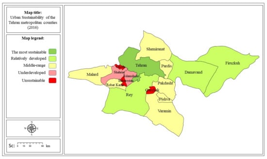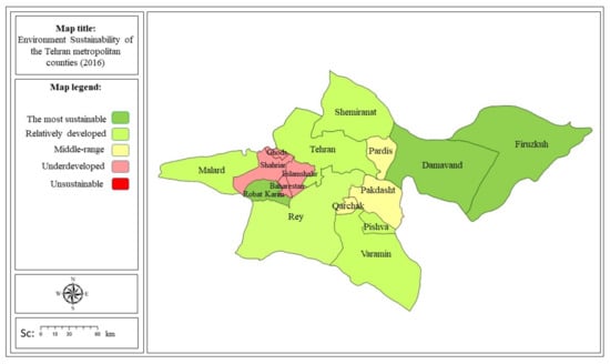 The results of this study illustrate that there are various socioeconomic inequalities and also environmental injustice challenges that undermine the level of sustainability achieved in Iran. Table 17 demonstrates the ranking of Tehran Province counties based on the sustainable development indicators. Results from the F’ANP model illustrate the level of sustainability in the regions. Tehran’s regions would be the most sustainable if their results were greater than 0.4. Being between 0.3 and 0.4 shows that the region is relatively developed. Middle range regions have scores between 0.23 and 0.3. The results of underdeveloped regions are between 0.2 and 0.23, and the scores of unsustainable regions are below 0.2. Tehran County has been ranked first over a period due to the dominant focus of facilities in this region. After Tehran, Firuzkuh and Damavand counties were in the next ranks and Qarchak, Ghods, and Baharestan counties were the weakest based on the sustainable development indicators. Moreover, Table 18 reveals the sustainable development transition of these counties from 2006 to 2016. Also, Figure 12 shows the urban sustainability of Tehran’s counties in 2016. In general, it can be noted that Tehran County had better conditions than its counterparts due to its existing capacities and being the capital of Iran. Furthermore, most of the youngest counties were among the worst in terms of the sustainablity indicators.