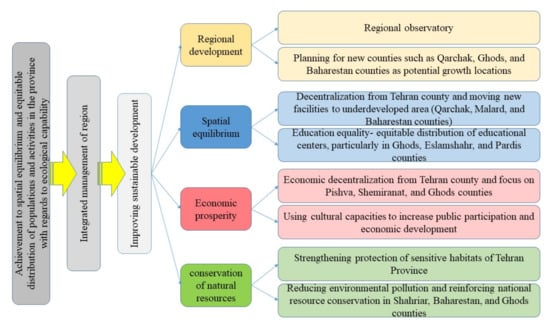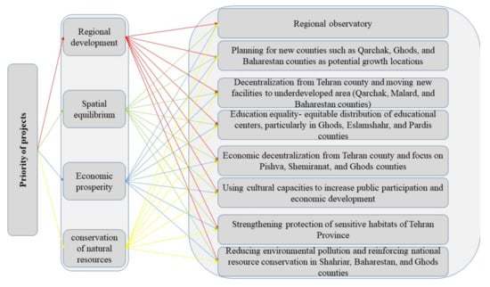 Regarding the perspective of sustainable development and achieving SDG11, the ultimate goal is reaching spatial equilibrium, equitable planning, and considering ecological capability in this region. These aims follow regional integration that leads to the improvement of sustainability. To reach sustainable development in Tehran Province, the authors anticipate prevention or mitigation strategies and action plans to prioritize areas where the sustainability level is decreasing or where this level remained low over time. That is, eight different strategies are presented in regional development, spatial equilibrium, economic prosperity, and conservation of natural resources categories. Figure 13 illustrates the strategic planning of regional sustainable development in Tehran Province. Different colors in this Figure demonstrate how various projects are related to their categories.