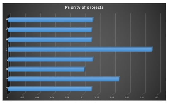 These presented projects were then prioritized with the help of Super Decision software by considering four different criteria such as the costs of projects, time of the projects, theoretical approach realization, and reaching sustainable development goals. Figure 14 shows the hierarchical analysis structure of presented projects. Different colors of arrows demonstrate the relations among criteria and projects. Following this figure, Figure 15 illustrates the priority of projects after implementing the model.
