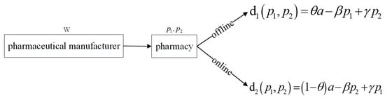 This paper considers a two-echelon pharmaceutical supply chain that consists of a pharmaceutical manufacturer and a pharmacy with an O2O mixed channel. The pharmacy buys medicines from the pharmaceutical manufacturer and then sells to the patients via offline and online channels. The model is illustrated in Figure 1. The pharmaceutical manufacturer’s unit production cost is and the sales price is , . Additionally, offline unit cost is defined as and offline unit price is defined as . Online unit cost is defined as and online unit price is defined as . We assume and to ensure that marginal profits of the pharmaceutical manufacturer and pharmacy are positive. The government imposes a wholesale price cap on the pharmaceutical manufacturer, and we set the wholesale price cap as .
