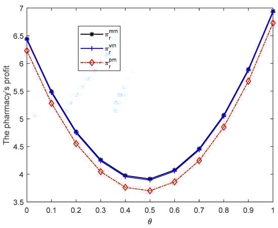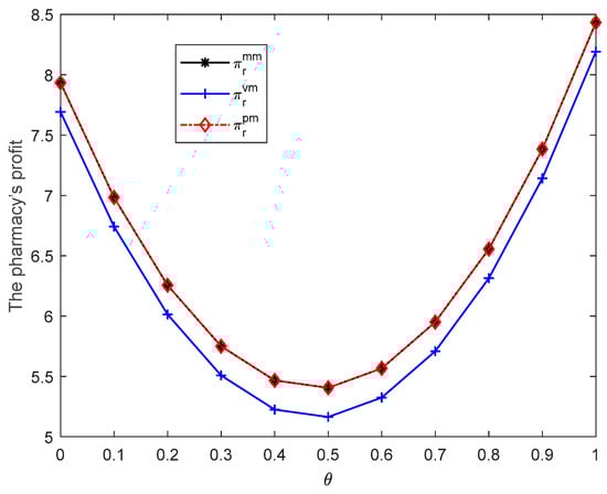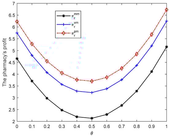 Figure 3 illustrates that if , the pharmacy’s optimal profit will be the highest when the pharmaceutical manufacturer is the Stackelberg leader in the market; the pharmacy’s optimal profit will be in the middle when the pharmaceutical manufacturer and pharmacy are in a balanced market; and the pharmacy’s optimal profit will be the lowest when the pharmacy is dominant in the market. It means that the pharmacy’s dominant force in the market is not conducive to gain more profit in this case.