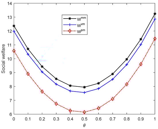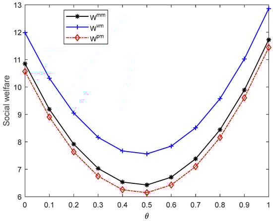 When the wholesale price cap is lower than the optimal wholesale price in the MS model (), social welfare in three different power structures is shown in Figure 5, Figure 6 and Figure 7.