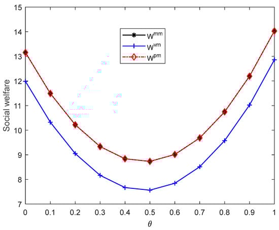 Figure 6 illustrates that if the wholesale price cap is higher than the optimal wholesale price in the PS model and lower than the optimal wholesale price in the VN model (), the optimal social welfare will be the highest when the pharmaceutical manufacturer is the leader in the market, the optimal social welfare will be in the middle when the pharmaceutical manufacturer and pharmacy are in a balanced market, and the optimal social welfare will be the lowest when the pharmacy is dominant in the market.