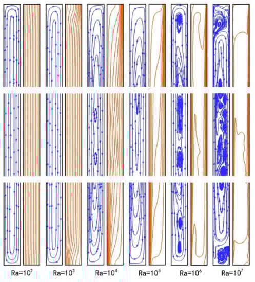 - When the Rayleigh number exceeds 102, the streamlines and isotherms show parallel distributions, indicating that the heat flux caused by the convection mechanism is negligible.