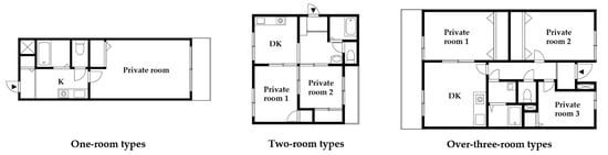 - Hirayama, Y.; Kawata, N. Housing conditions of young, unmarried, low-income people. J. Archit. Plan. (Trans. AIJ) 2015, 80, 2303–2313. (In Japanese) [Google Scholar] [CrossRef][Green Version]