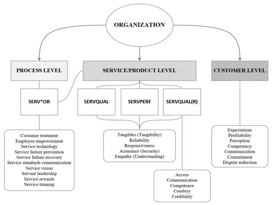 Parasuraman, Zeithaml, and Berry [] developed SERVQUAL, a service quality assessment model, through a series of follow-up studies, which enabled the objectivity of the assessment to be achieved despite the physical intangibility of the service. The authors of the model introduced 5 factors: tangibles, reliability, responsiveness, assurance, and empathy. Later, Parasuraman, Berry, and Zeithaml [] modified the SERVQUAL model by extending it with the following factors: access, communication, competence, courtesy, and credibility. The SERVQUAL model is still widely used in recent scientific studies (e.g., [,,,]). It is the foundation on which customers’ perception of service quality is built. On the other hand, researchers note that the model is not suitable for all service types, business models, and industries [,]. These and some other shortcomings of the SERVQUAL model have inspired researchers to look at service quality and the model itself in a new light. For example, Durdyev Serdar et al. [] studied customer satisfaction across five service quality factors: reliability, responsiveness, assurance, empathy, and tangibility. The authors found that all five service quality factors have a positive impact on customer satisfaction, which leads to future customer behavior—loyalty. The SERVQUAL model became the basis for other models. Raišys and Baranauskas [] proposed the combined approach to interlinkage between key service quality assessment models, based on SERVQUAL model, and their constituent criteria, which are most cited in academic literature (Figure 1).