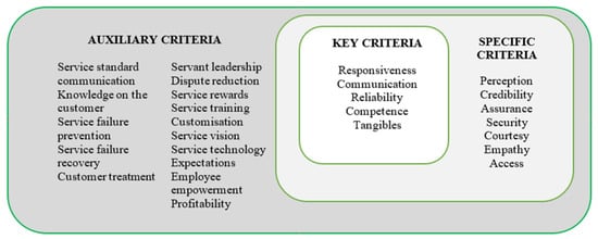 As can be seen, the reviewed models present sets of important factors of service quality, nevertheless, do not differentiate them according to priorities or a level of significance. As a result, service providers may face a potential problem. Aiming to achieve high customer satisfaction they may place organizational resources on aspects of service quality that customers will not perceive as critical. To address this gap, we propose a theoretically based approach to service quality criteria system (Figure 2). Here, “Key criteria” are criteria presented in the majority of SERVQUAL, its derivatives and other analyzed models and concepts. The “Specific criteria” consists of criteria that are stressed as important in some but not all analyzed models and concepts. Finally, the “Auxiliary criteria” are those that are mentioned in a minority of the models and/or are attributed to specific industry sectors.