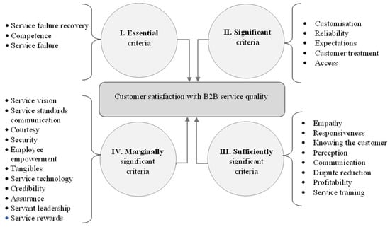 Monitoring and evaluating customer satisfaction allows service providers to identify specific areas for improving their performance. Analysis of the academic literature shows that customer satisfaction is mostly based on the SERVQUAL model or its variations such as SERVQUAL (Refined), SERVPERF, etc. Milner and Furnham [] observe that the criteria for assessing service quality, as defined in these models, are repeated in almost every academic study that examines customer satisfaction. Some less commonly used models, such as SERV*OR [], also offer criteria for assessing service quality. Thus, researchers have been trying for decades to purify a set of criteria covering a range of customer satisfaction characteristics but have not delved deeply enough into the extent to which specific service satisfaction factors are meaningful to the business customers themselves. In other words, there is a gap in the academic literature for science-based evidence on the priorities of customer satisfaction criteria.