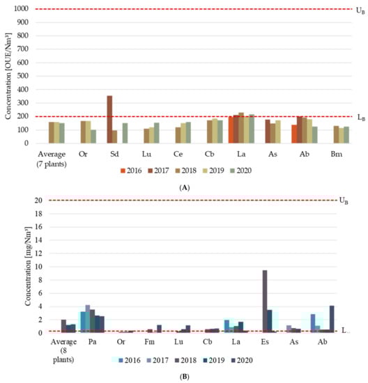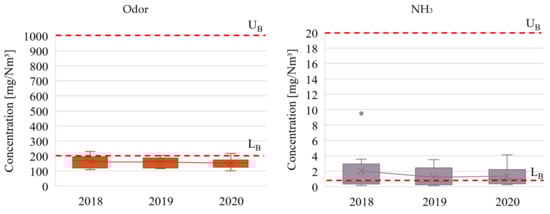 - Comparison of the environmental performances of the plants to the BAT-AELs defined for odor and NH3 concentration: Odor emissions (151 ± 35 OUE/Nm3 in 2020) were mostly below the lower BAT-AEL (200 OUE/Nm3), with lower (−17%) values for anaerobic/aerobic combined processes compared with aerobic processes. NH3 concentrations in the exhaust air (1.35 ± 1.36 mg/Nm3 in 2020) were slightly above the lower (0.3 mg/Nm3) and significantly below the upper BAT-AEL (20 mg/Nm3).