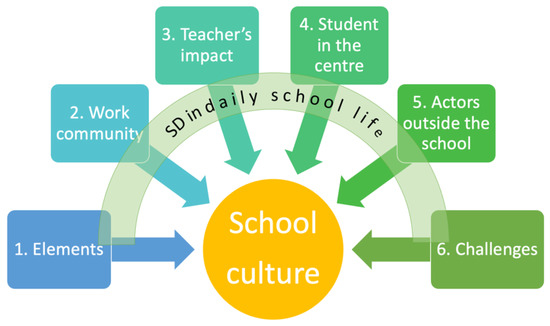 The term school culture does not have a single definition and is used, for example, to understand the school’s ethos, school climate, school code, or the school’s operating culture [3]. School culture is one of the indicators of organisational effectiveness and the quality of the school. The quality of school culture affects the quality of the overall way of life in school. In this study, the term school culture is understood according to Fullan’s [4] definition as the guiding beliefs and values evident in the way a school operates. It includes norms, rituals, and school traditions [5] and can be used to encompass all the attitudes, expected behaviours, and values that impact how the school operates. The kind of school culture that prevails in a school is central to sustainability and sustainable development.