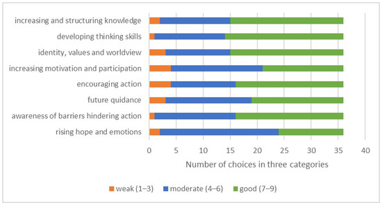 The reliability of the analyses was based on the stages of the data-based content analysis; they were carefully documented, allowing the origin of each conclusion to be traced from the data. This improved the reproducibility and reliability of the study [79]. Since the essay analyses were conducted by one researcher, the interpretation of the topic could affect the results of the qualitative study. Efforts have been made to reduce the impact of the interpretation on research results through systematic data processing, repetition of work stages, and regular documentation of work stages. Although objective research has been done during the research process, the researcher’s subjective experiences and perceptions still play a role in the reduction of expressions. Utilising two different types of the data collection (essay and questionnaire) adds to the reliability of the study. The foundation of the analysis on the questionnaire was designed in the earlier stage of this study process, and the methods’ description and results can be found in Yli-Panula et al. [75]. As the student teachers were filtered from the original data, and only a few questions were included in this study, all analyses for the responses to the questionnaire were repeated with the original data. The original thematic classes were used as a foundation, but they were refined and reduced, since not all the contents were found in the answers of student teachers. Due to the reduced size of the data set, the level of detail could also be increased. All classification decisions were thoroughly discussed with the whole group of authors.