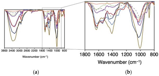 ATR-FTIR spectra of the different compost samples in (a) a wide range and in (b) a short-range frequency. CDDW (purple), CVDW (red), CVA (green), CA (orange), CUW (blue), CSS (dark blue), CLW (brown) and FLW (grey). The ATR-FTIR spectra of the analysed samples are in the same scale.