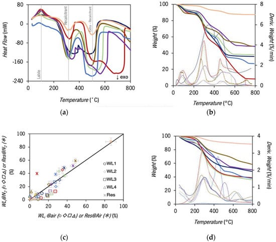 The shape of the TGA curves in air, regarding the two first peaks, is similar. A third and, for some samples, a fourth peak are also visible. The differences between the shapes and the position of the peaks can be observed through the corresponding DTG curves (dotted lines in Figure 2b). Although all the DTG peaks are rather asymmetrical the third peak is particularly uneven, indicating that this peak results from the overlay of multiple single processes. From the DTG curves, four temperature ranges were defined and related to four main processes: dehydration and desorption processes (WL1, 30–177 °C) [,], decomposition of the easily biodegradable aromatic structures (carbohydrates moieties and aliphatic compounds) (WL2, 177–400 °C) [,], decomposition of the most stabilised organic matter (WL3, 400–620 °C) [] and decomposition of inorganic carbonates (WL4, 620–800 °C) []. According to the temperature range of each process, an association can be established between the decomposition processes and enthalpies, namely WL1 can be associated with H1 (related to dehydration and desorption processes); WL2 with H2 (corresponding to decomposition of the recalcitrant substances) and WL3 + WL4 with H3 (associated to decomposition of the extra-recalcitrant substances and carbonates).
