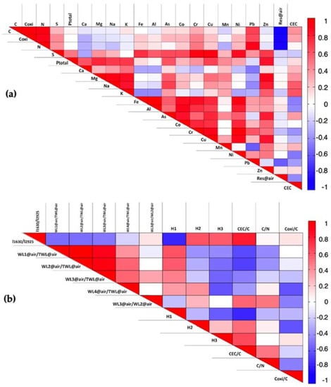 In Figure 3b, the most prominent positive correlations (r > 0.7) are among the following variables: (i) I1630/2925, H3 and CEC/C; and (ii) WL1@air/TWL@air, WL2@air/TWL@air and WL3@air/TWL@air. At the same time, negative correlations (|r| < 0.7) are found for: (i) I1630/2925 and CEC/C with H1; (ii) WL4@air/TWL@air and H2 with Coxi/C; and (iii) WL1@air/TWL@air and WL2@air/TWL@air with CEC/C.