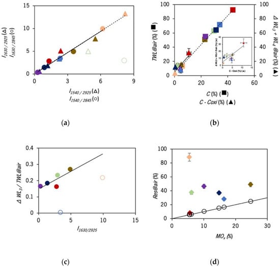 Correlations between characterization data from ATR-FTIR, TGA, EA and ICP-OES of the compost samples CDDW (purple), CVDW (red), CVA (green), CA (orange), CUW (blue), CSS (dark blue) and CLW (brown): (a) (▲) I1630/2925 vs. I1540/2925 and (●) I1630/2845 vs. I1540/2845 where the full line represents the linear fitting (r = 0.99). Data from CVA (open symbols) were not included in the fitting; (b) (◼) TWL@air vs. C and the dotted line represents the linear fitting (r = 0.99), (▲) ΔWL3 + WL4@air vs. non-oxidizable carbon content (C-Coxi) and the full line represents the linear fitting (r = 0.84); (c) (●) ΔWL3/TWL@air vs. I1630/2925 where data from CUW and CVA (open symbols) were not included in the fitting and the full line was obtained by linear fitting (r = 0.81); and (d) (◆) Res@air vs. MOx, where open symbols are estimates of the total metal oxides mass, and the line represents y = x.