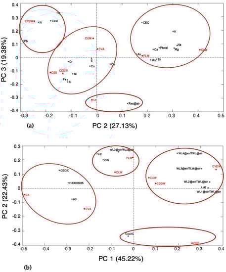 The three first principal components in PCA1 explained 83.85% of the total variance. Figure 5a shows the simultaneous representation of the loadings and scores on PC2 against PC3. The biplot of PC2 and PC3 was considered the most adequate to portray the differences between the samples, taking into account the nature of the samples, despite the explained variance of PC2 and PC3 being moderate (27.13% and 19.38%, respectively). This observation is in agreement with previous studies where it was shown that sometimes the main information of a dataset is not present in the PC with the highest explained variance [,]. In the biplot of PCA1, two samples are isolated and the remaining can be aggregated in two groups despite the distance between some of the samples, which in some cases is considerably large. The samples FLW and CLW (both derived exclusively from animal wastes) can be grouped on the PC2 positive side. The distinction is associated mainly with higher values of the macronutrients P, K, Ca and Mg and of CEC. The CUW, CVA, CSS and CDDW may be grouped on PC2 and PC3 negative values. This group stands out for the values of the macronutrient S and of the micronutrients Cr, Cu, Fe, Al, and Ni, wherein CSS displays the highest values. The compost samples CA and CVDW, that show up isolated, are separated from the other groups, CVDW on the negative side of PC2 and on the positive side of PC3 and CA on the negative values of PC2 and PC3. Although CVDW stands out for the highest values of N, C, Coxi and Pb, CA is highlighted for the highest values of residue (Res@air).