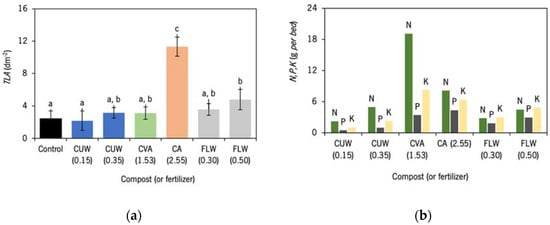 Results of this study, in Figure 6a, display the total leaf area obtained for the composts and organic fertiliser applications and for the control with native soil. Fertile soil may be used as a control to evaluate the effect of compost application [,]. Despite the tested samples being fitted for agricultural purposes, only the compost CA (assigned with c) and the organic fertiliser FLW at the highest dose (assigned with b) promoted a significant increase in the total leaf area (TLA) in relation to the control (Figure 6a). The results that cannot be differentiated from the control are assigned with a. Results from CUW (0.35), CVA (1.53) and FLW (0.30) are assigned with a, b because they cannot be statistically differentiated either from the control or FLW (0.50). Regarding the compost dosage effect, no significant differences were detected on TLA for CUW and FLW when comparing the minimum and maximal doses recommended by producers, suggesting that the lower dose was sufficient to maximise the vegetative growth for this productivity variable and for this plant crop species.