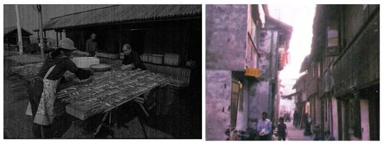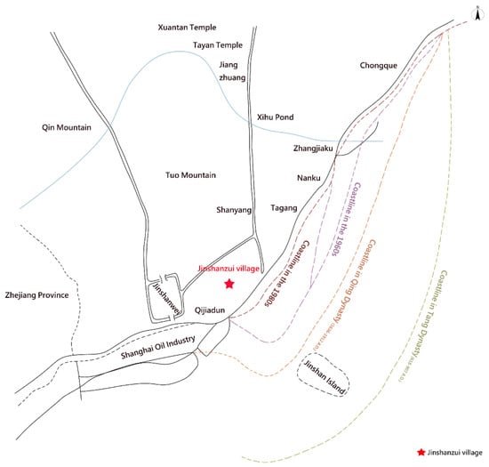 Alterations of the external configuration of Jinshanzui village were presented through its coastline and entire layout. Jinshanzui village is east of Hangzhou Bay and has experienced a smooth collapse towards the land since the Tang Dynasty (618–907 A.D.). Its coastline was historically only influenced by nature, such as flow change and climate, because people did not live there nor were settlements formed at the shore [55]. Until the Qing Dynasty (1636–1912 A.D.), the coastline changed dramatically and changed into the form of “几” before the 1960s [56]. Thus, these alterations were strongly impacted by nature. People who lived there started to hunt fish. A fishing village then began to develop [33]. Villagers built habitat areas on the shore, where most fishermen worked and traded. After the 1980s, with the acceleration of the fishery at Jinshanzui village, the inhabitants hunted fish on the sea and started relevant business on the shore [33]. Thus, the coastline receded and formed the current one (Figure 4).