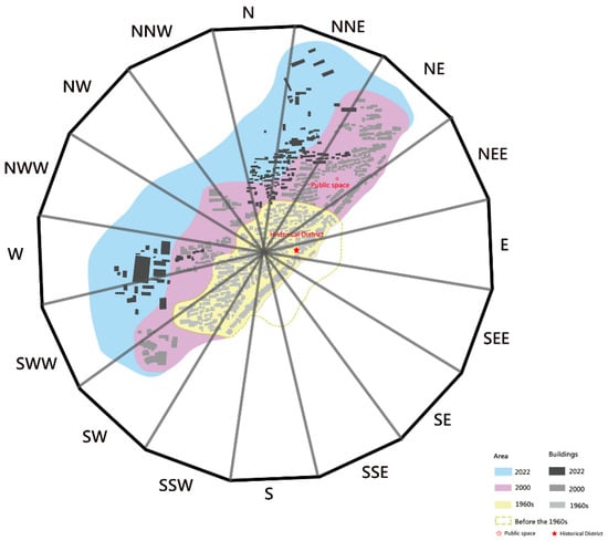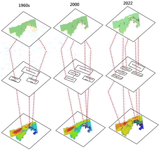 As shown in Figure 5, the village had not been formed until the 1960s, and only the alteration of the coastline influenced the outline of this space. In the 1960s, buildings in Jinshanzui village were distributed along the coastline. Until 2000, the layout had the Historical District as the core and developed linearly. The current configuration is similar to this, though building development is accelerated and scattered in the northwest (Figure 5).