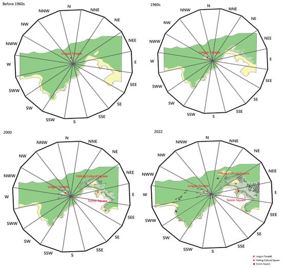 Compared with Jinshanzui village, the coastline in Tianao village has had little alteration. However, its shore space changed due to sea reclamation and human activities [35]. From Figure 5, we can see that Tianao village was similar to Jinshanzui village and that few people lived there before the 1960s. Inhabitants had migrated there gradually until the end of the 1950s. Most inhabitants lived for the fishery, because the village was near the sea and most of its area was forestry. A fishing village was formed in the 1960s, and because of its natural condition, the alteration of the external spatial configuration in Tianao village relates to its surrounding ecotope. The fishing village is dominated by forest, and the habitat area is in the southeast. The central area is mountainous, where few people live. In the 1960s, there were few villagers in Tianao village, and their buildings were concentrated in the southeast near the shore. Lingyin Temple, in the central peak, was built in 943. It has long been the center of spirituality for the locals. In 2000, owing to the sea reclamation, the habitat area was gradually moved to the shore. The temple was developed as a scenic spot, and more people tended to build houses and start businesses around it. Currently, because the shore is occupied with buildings, most new buildings are built in the northeast, inland, which has destroyed the forest. Forest and shores around the central area have shrunk (Figure 6).