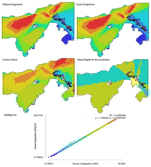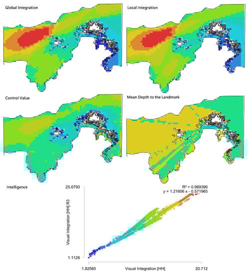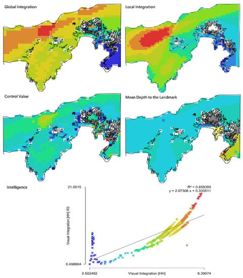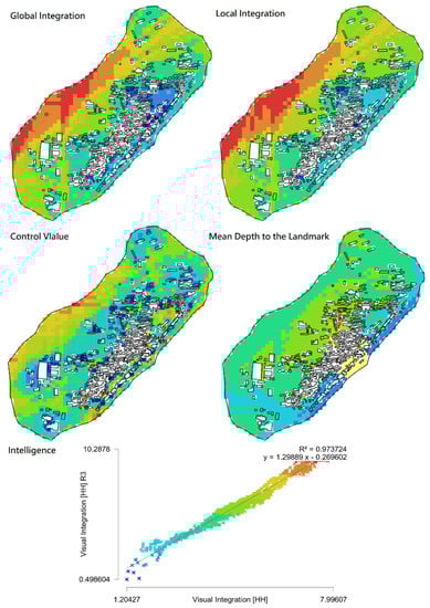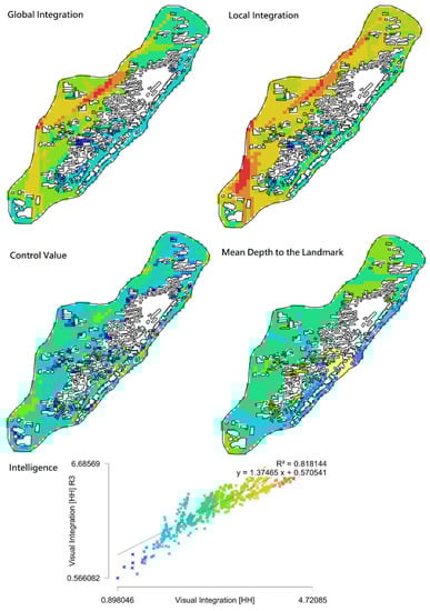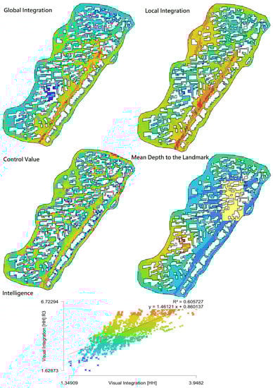 Intelligence is the ratio of local integration and global integration, demonstrating the stimulation of the entire spatial configuration from the partial space layouts. The coordinates of the intelligence consist of the scattered plots, trend line, and fitting degree (R2). The abscissa of scattered plots is the global integration, and their ordinate is the local integration. Scattered plots demonstrate the discordance between the partial space and the entire space. Trend line is the minimum distance from all points to the line. The steep trend line indicates that the local integration is better than its global integration, and the space has its characteristics. R2 means the connection between the abscissa and the coordinate of scattered plots. Its value being higher than 0.5 indicates a close connection between the partial space and the entire space [43]: