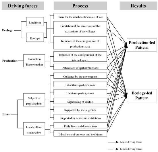Prior work has analyzed the patterns of historic rural landscape alterations based on the landscape multifunctional theory. The outcome of this analysis validates different patterns of the historic rural landscape from the perspectives of ecology, production, and lives, both diachronically and synchronically. Production elements were major driving forces of the production-led alterations of historic rural landscapes. In the process of production transformation, the internal spatial configuration and functions were altered. The fishery and its relevant industries started on the shore, where they were near to the raw materials and had open space. The commercialization and tourism industries started in open spaces with optimal accessibility and visibility. Residential areas were located in independent spaces, which were quiet and suitable for living. Ecological elements were minor driving forces and impacted the shore and external spatial configuration. The major driving forces of the ecological pattern of historic rural landscape change were ecological elements. The surrounding environment and landform can influence site selection, external spatial configuration, and internal production function. The production elements were minor driving forces because production transformation merely influenced the habitat area. Most habitat areas were concentrated on the valley and the shore. With the development of tourism, habitat areas with high global integration were revitalized into public spaces. The village was also divided into tourist and residential areas. Moreover, the historic rural landscape was developed from a space with single production to a complex space with many production types and various results. The living element influenced the two patterns of the historic rural landscape, which can be regarded as the basic driving forces. The alterations of the two patterns of historic rural landscape were related to their cultural connotation and were formed by various subjective participations.
