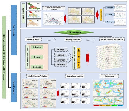 In this study, we aim to propose an integrated GIS-based approach to identify the spatial and temporal vulnerability to the risks of urban traffic accidents in Tabriz using road accident data and to explore the spatiotemporal relationship of seasonal accident density. For this purpose, accident data for April 2018 to November 2020 were obtained from the Traffic Police of Tabriz city. The research methodology was established based on the GIS spatial and network analysis. To evaluate the impact of COVID-19, the seasonal changes of car accidents were used as a time dimension to analyze the decrease and/or increase in the number of urban traffic accidents. The severity index (SI) was applied to analyze the severity of injuries caused by the accidents. In other words, the SI allows us to examine the spatial-temporal patterns of urban traffic accident hotspots in Tabriz during different seasons. This index has been used by the Belgian government to determine the severity of each accident using different coefficients for different types of crashes [35]. Finally, we examined whether there is any association between the accident rate, land use and population density. To visualize the spatiotemporal data, an integrated approach of the GIS-based Comap method was applied. The Comap method is an effective technique to visualize multivariate data to detect the spatiotemporal patterns within complex data [36]. In addition, the SI was also employed to recognize the high-risk regions using accident data. Then, using the kernel density estimation (KDE), high-intensity areas were obtained based on the calculated index, and the accident hotspots were identified. Eventually, using demographic and land use data for Tabriz city, areas with a high risk of road accidents were identified. Figure 2 shows the flowchart of different methods used in this research.