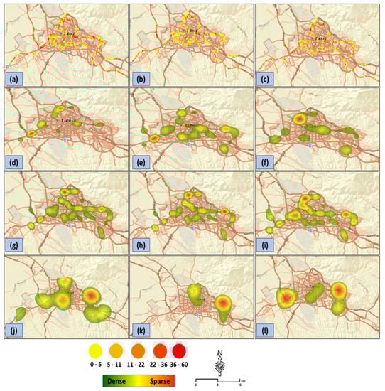 General distribution of the frequency of accidents and injuries in Tabriz from 2018 to 2020, including: (a) Total number of accidents in 2018, (b) Total number of accidents in 2019, (c) Total number of accidents in 2020, (d) Damage density in 2018, (e) Damage density in 2019, (f) Damage density in 2020, (g) Injuries density in 2018, (h) Injuries density in 2019, (i) Injuries density in 2020, (j) Death density in 2018, (k) Death density in 2019 and (l) Death density in 2020.