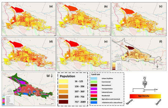 Land use and demography maps: (a) Age 0–10, (b) Age 10–20, (c) Age 20–35, (d) Age 35–45, (e) Age 45+, (f) Population Density based on number of people and (g) Land use map.