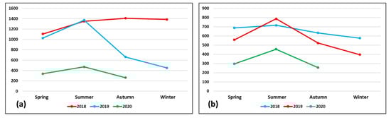 The trend of urban traffic accidents from 2018 to 2020 in Tabriz: (a) Variation in the number of accidents and (b) Variation in the number of injured people.
