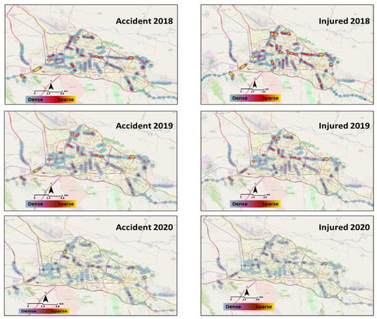 Urban traffic accident hotspot maps for the observed accidents and injuries from 2018 to 2020.