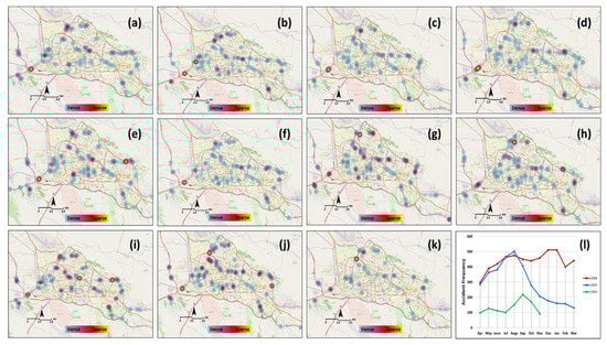 Seasonal spatiotemporal variation in urban traffic accidents: (a) Spring 2018, (b) Summer 2018, (c) Autumn 2018, (d) Winter 2018, (e) Spring 2019, (f) Summer 2019, (g) Autumn 2019, (h) Winter 2019, (i) Spring 2020, (j) Summer 2020, (k) Autumn 2020 and (l) Annual variation chart.