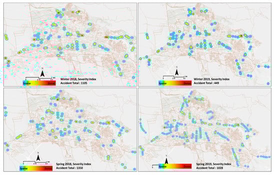 The results of this analysis show that, although the number of accidents is higher in spring than in winter, the rate and intensity of winter accidents and injuries is more severe (Figure 8). According to Figure 8, there were 1105 accidents in the winter of 2018, which is significantly reduced to 449 in same season in 2019. The results are similar when comparing the number of accidents in the spring of 2018—1350 accidents—against the same season in 2019, with a total of 1028 accidents. From the geographical perspective, this figure clearly indicates that the urban road network in northern areas of the city were more vulnerable to urban traffic accidents. According to the results, the urban road traffic accident hotspot analyses with and without a severity index yielded relatively similar hotspots, but the rankings of some hotspots were quite different when considering the accident SI. After analyzing the ranking, the effect of the accident SI on the results can be easily observed.