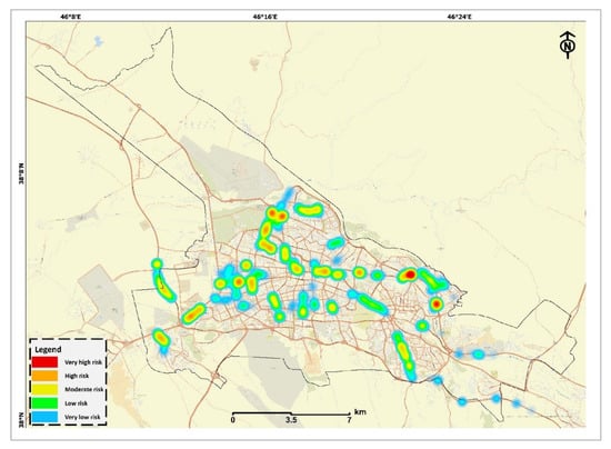 The kernel density estimation (KDE) can be applied as a nonparametric density estimation technique in the GIS environment. As a common GIS algorithm, the KDE can be used to create a density map based on the hotspots of car accidents to show the density of the accident points. The KDE method can impressively reduce the impact of noise by allocating equal noise to the input data [39]. In fact, the GIS-based KDE is the most popular method for identifying high accident risk locations on the road networks and has been employed by numerous researchers [40,41,42,43,44,45,46,47,48,49]. Thus, applying the KDE enables us to calculate the severity of risks within an accurate research bandwidth in the study regions to generate a smoothed surface.