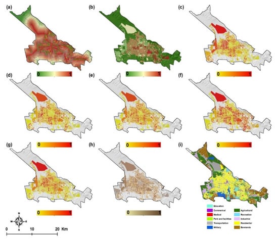 Spatial distribution of the impact indictors of urban traffic accidents, including: (a) urban road traffic, (b) educated population, (c) population in age group 0–10, (d) population in age group 10–20, (e) population in age group 20–35, (f) population in age group 35–45, (g) population in age group 45<, (h) population density and (i) urban land use/cover.
