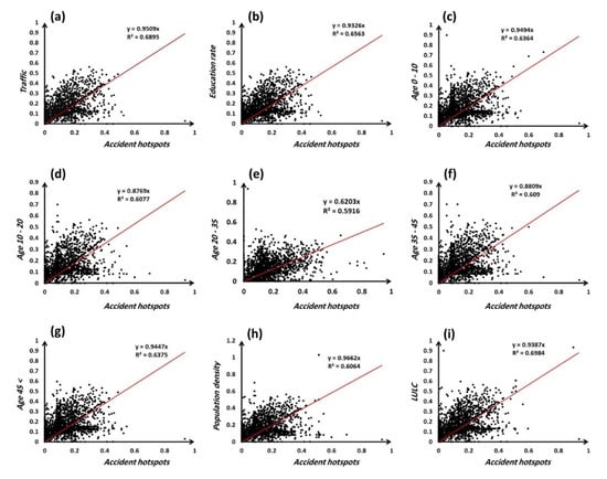 Results of the spatial correlation assessment of the aggregated urban traffic accidents and relevant impact factors, including: (a) urban road traffic, (b) educated population, (c) population in age group 0–10, (d) population in age group 10–20, (e) population in age group 20–35, (f) population in age group 35–45, (g) population in age group 45<, (h) population density and (i) urban land use/cover.