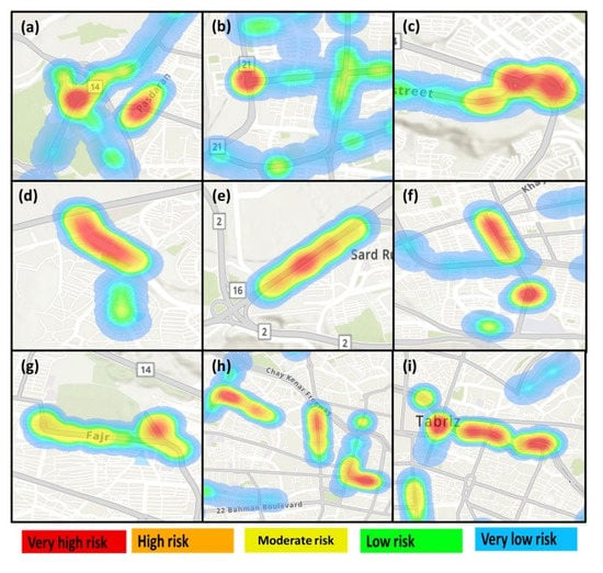 In the context of urban traffic accident modeling, various algorithms and methods for the classification of different types of accidents have been developed, of which the density-based methods can be used to determine high-risk areas [22]. Based on the increasing trend of road accidents, it is necessary to identify the accident hotspots. In this context, the locations, which are identified by a high accident occurrence compared with other locations, are known as hotspots or black spots, which can be identified through GIS spatial and network analysis [23].