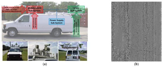 (a) Georgia Tech Sensing Vehicle equipped with sensors and (b) pavement range data collected by 3D laser system.