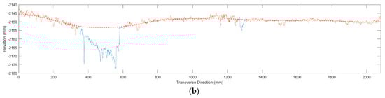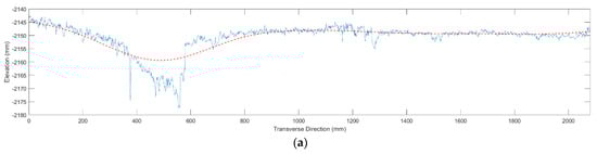 Rectification can be performed using the moving average of each transverse profile to extract the general shape of the pavement. Then, the values from the moving average profiles are subtracted from each corresponding transverse profile to obtain the rectified profiles. However, if the transverse profile contains areas that have large elevation drops over a wide area, as the length of the area approaches the moving average window size, the rectified image can no longer preserve the amount of elevation change visible on the original range image, Figure 5a shows how the moving average (red line) would “dip” at a location with high material loss. Since the objective of the proposed method is to quantify both the aggregate loss area and aggregate loss volume, not being able to preserve the elevation change will cause an underestimation of the aggregate. Therefore, areas with “wide raveling” need to be identified and treated differently in rectification. Figure 5b shows rectification with wide-raveling identification; the moving average (red dashed line) captured the general shape of the pavement without a “dip” at the location with high material loss. The moving average algorithm used in this figure has a window size of 20, which is 20 mm in real-world distance.
