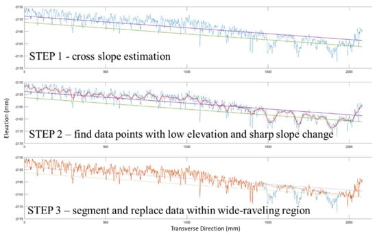 Figure 6 shows how wide-raveling identification is performed. First, the cross slope is estimated by fitting the transverse profile (blue line) with a first-order polynomial (purple line). Second, the moving average with a small window size (window size = 20) is used to smooth out the transverse profile (red line). Then, areas with low elevation, defined as a lower threshold than the fitted first-order polynomial (green line) and also accompanied by a sharp elevation change (defined based on the profile slope) are segmented and labeled as a wide-raveling area. During rectification using a moving average, to avoid using data from the wide-raveling area, data points within each wide-raveling area are replaced by a linear interpolation between the beginning and end of each wide-raveling area, as shown in Figure 6 Step 3.