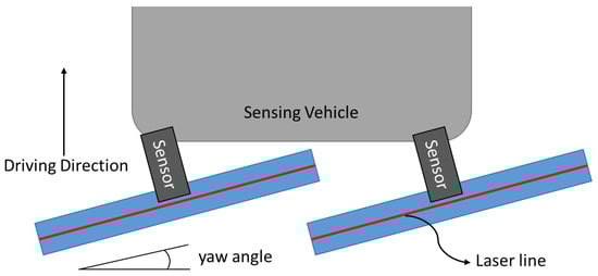 Top-down view of the sensor setup and yaw angle of the laser lines.