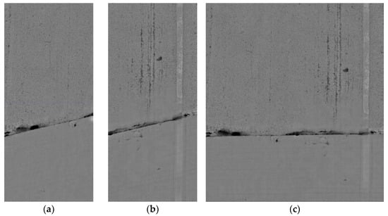The laser system equipped on the GTSV uses two 3D laser sensors to collect pavement range data. Because the sensors are set up to have a small angle between the line laser and the transverse direction of the road to avoid the laser from one sensor interfering with the other sensor, as shown in Figure 7, the range image collected is skewed from its actual orientation. In Figure 8a,b range images collected by the laser sensors on the GTSV are shown; each image covers roughly half the width of the traveled lane. The pavement joints on these images are actually in the transverse direction of the road, but because of the angle of the sensor, the pavement joints in the images are skewed. Therefore, after rectification, the range images are rotated and stitched to form a full-lane pavement image, as shown in Figure 8c.