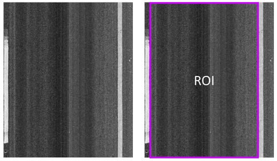 The 3D laser system used in this study collects range images and intensity images of the pavement. From the intensity images, highly reflective surfaces, such as pavement markings, can be easily identified, as shown in Figure 9. By selecting the ROI for the detected loss of aggregate within the lane marking, this process effectively removes other features, such as pavement markings, road reflectors, rumble strips, and cold joints at the edge of pavements, which may be captured by the laser sensors. Removing these features reduces noise and makes the pavement within the ROI more predictable, thus improving the performance of the proposed method.