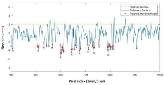 With the reference surface established, each pixel is evaluated. Using simple thresholding, any pixel that is more than 4.75 mm lower than the reference surface is marked as a potential aggregate loss pixel, as shown by the red cross markers in Figure 10. The 4.75 mm threshold was chosen based on the recommended gradation for OGFC, as 75–90% of the aggregate used in OGFC is larger than 4.75 mm in size [21].