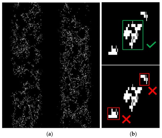 (a) Binary image of potential aggregate loss. (b) Top right: example of accepted connected components. Bottom right: examples of rejected connected components.