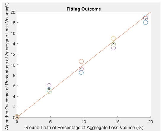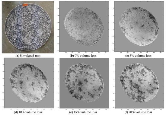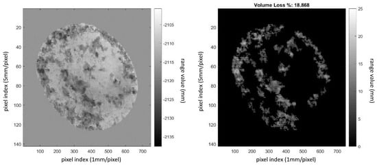 Finally, with a filtered binary image, aggregate loss can be quantified. The proposed method quantifies both the percent of the aggregate loss area and the percentage of the aggregate loss volume. The total aggregate loss area () and total aggregate loss volume () can be expressed as follows: