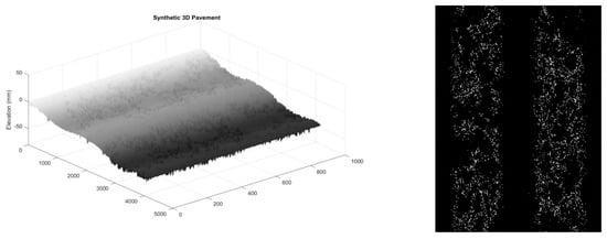 Due to the size constraint of the lab-fabricated pavement mat, the effects of cross slope and pavement deformation, such as rutting, on the proposed method were not evaluated. In addition, only the performance of aggregate loss volume quantification was evaluated with the pavement mat; however, the performance of the aggregate loss area quantification should also be evaluated. To address these issues, a MATLAB script was developed to procedurally generate full-scale pavement images with known aggregate loss (Figure 15). The benefits of using synthetic images are as follows: (1) both the aggregate loss area and aggregate loss volume can be controlled; (2) the versatility provided by the synthetic pavement image allows for more pavement images with different raveling conditions to be evaluated (Figure 16); (3) the synthetic pavement can be generated to match the size of a full-scale range image, so cross slope and rutting can also be simulated. The MATLAB script works by using an image of Gaussian white noise to simulate the texture of an OGFC surface and is used as the base surface. Using procedural generation, the location of aggregate loss was defined by a random 2D binary reference image, and the script controlled how the binary image was generated to allow for a higher probability for aggregate loss to occur within the wheel paths and to prevent the generation of pixel groups that were too small to be considered aggregate loss. The elevation values (z-values) of pixels flagged as loss of aggregate were dropped to simulate material loss, and a rougher texture was applied to the areas with aggregate loss. The synthetic surface was then deformed to simulate cross slope and rutting. Finally, random noise was added to the whole image to simulate the image noise from a 3D imaging system.