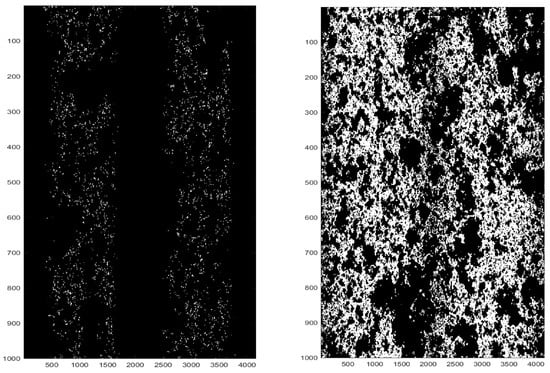 After marking all candidate pixels, a binary image of the pavement, such as shown in Figure 11a, of the pavement can be generated to indicate the locations of all candidate pixels. Because the binary image is obtained through thresholding based on the elevation, the image may contain small surface imperfections or voids between aggregates that should not be considered aggregate loss. To filter out these pixel groups, which are too small to be aggregate loss, each connected component on the binary image is evaluated based on its bounding box sizes. Because aggregate used in OGFC surfaces is typically 4.75–9.5 mm, and dislodged aggregates are likely to have surrounding materials attached, a connected component with a bounding box larger than 10 mm by 10 mm will be accepted as the loss of aggregate, and a bounding box smaller than 10 mm by 10 mm will be rejected. The filtered binary image will be passed down to the next step for loss-of-aggregate quantification.