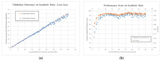 (a) Left: Validation outcomes of aggregate loss area using synthetic dataset, (b) right: buffered Hausdorff distance-based score and F1 score on synthetic dataset.